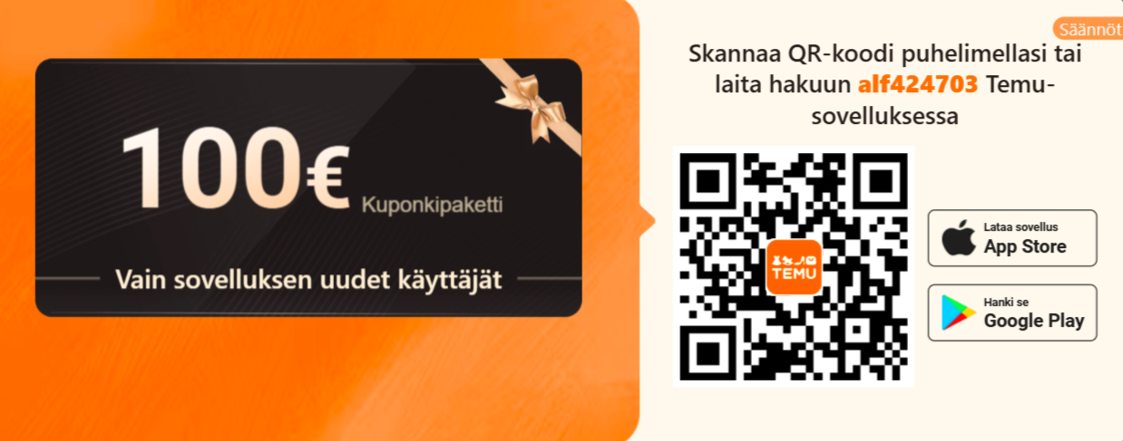 Syötä koodi ALF424703 Temu-sovelluksen hakukenttään saadaksesi 30% alennuksen ensimmäisestä tilauksestasi sekä 100€ kuponkipaketin.